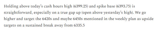 Today was rather straightforward on ES. The primary order of business was whether or not bulls sustained above yesterday’s spike (base and high). The range was incredibly small, not quite making it to 6420, so there was very little room for execution much higher than the spike.