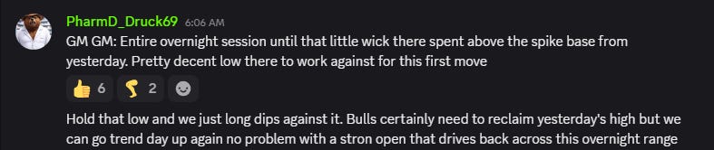 We can see that all of the action except for a single wick took place above yesterday’s spike base and most of the action was above yesterday’s high. We got a good low and firm rejection of prices below the spike base just before open.