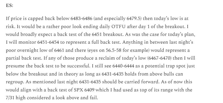 After an absolutely nasty PPI this morning, ES did nothing but back test its prior 6-week balance high overnight which triggered a LBAF of yesterday’s low for a long. We were using 6451-6454 as a range for the prior 6451 high. Low of night was 6453.25 and after a brief battle for yesterday’s low into the open, buyers reclaimed it and were off to the races. As of now the key back test has held and buyers continue to maintain in this week’s upper distribution.
