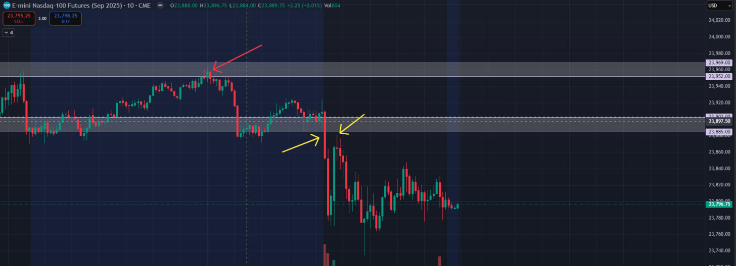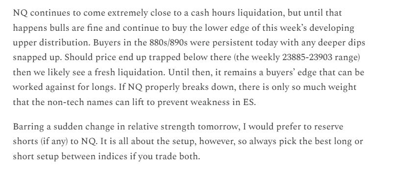 NQ had been relatively week after putting in a “good high” on Wednesday. YM broke a key structural area and went a bit crazy to the upside so non-tech components held ES relatively firm. I was therefore more interested in shorts on NQ into Friday.