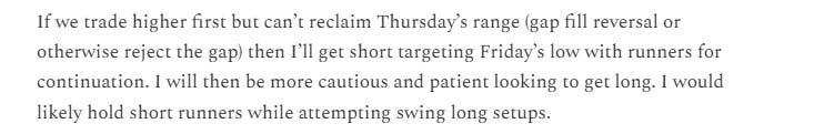 Bulls are still okay as long as Friday’s high (and now really Monday’s low) are protected, but testing higher first and failing is generally a poor look. This market has been quite strong for some time, and nearly impossible to fade. I am doing just that. In tonight’s plan I’ll discuss what would invalidate this for me along with downside targets and where I would look to add to the position if indicated.