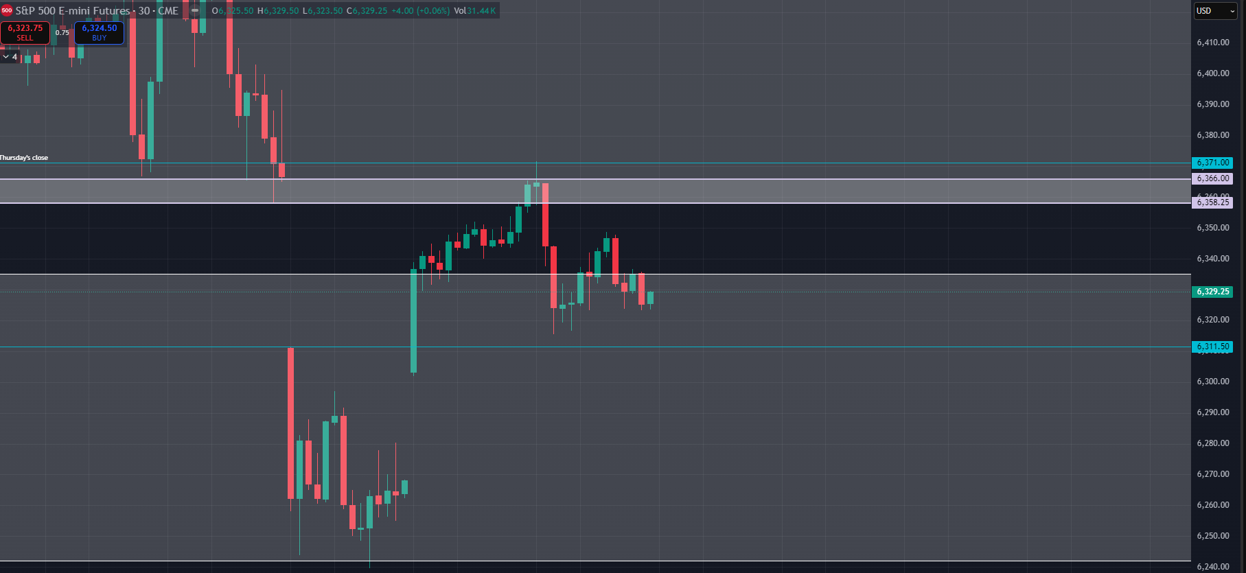 The big question for this week was whether we traded higher or lower first, and how price responded there. We traded higher first and got a gap fill reversal off Thursday’s close. We took puts in the Discord yesterday as close to the weekly 6358.8-6366 range as possible and had only a brief sweat this morning. From the weekly plan: