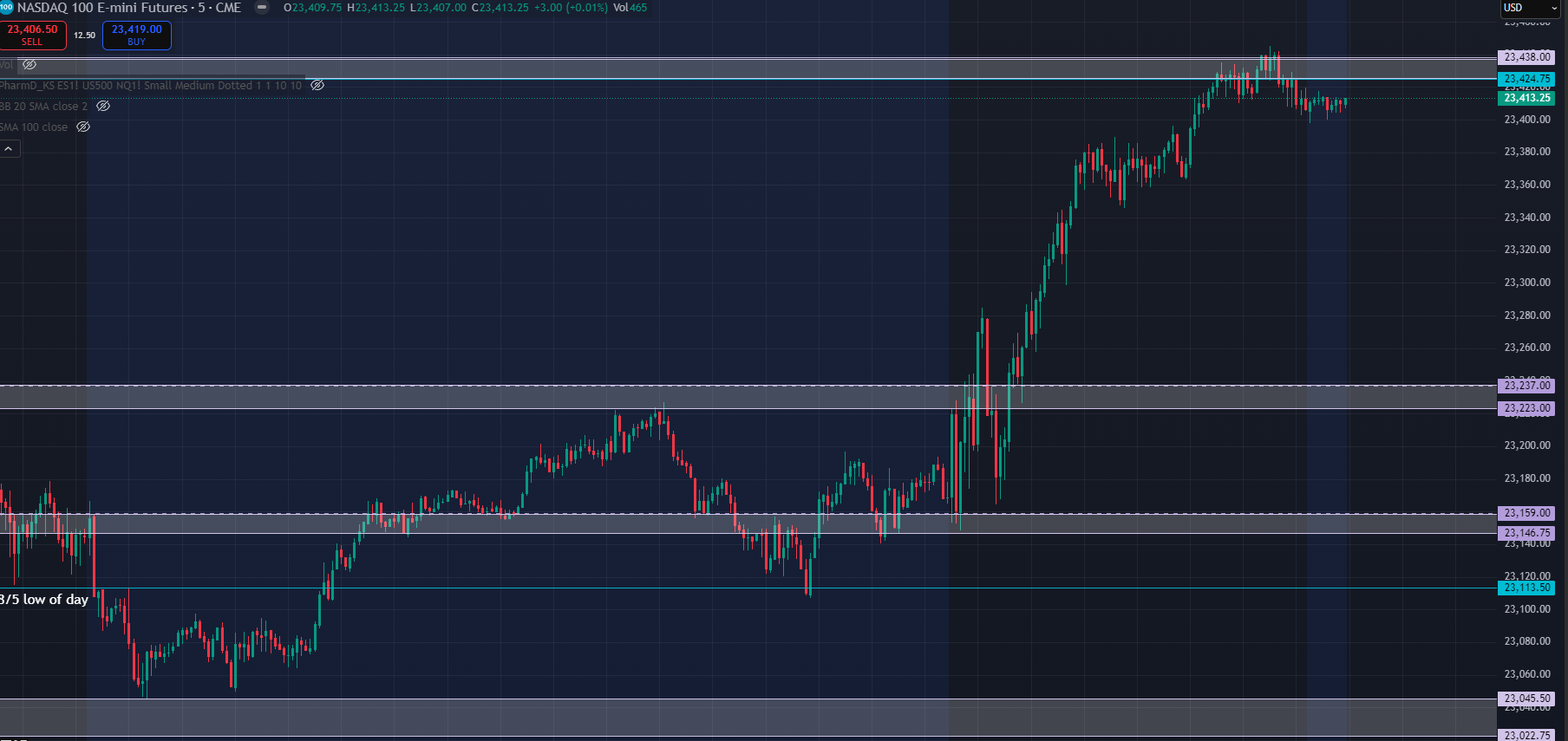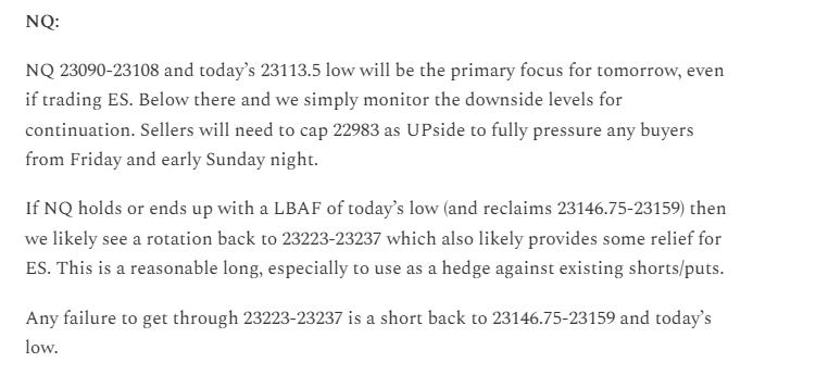 Sellers certainly didn’t find follow through today. I’ll recap NQ because it was clearly more important today. After taking out yesterday’s overnight low, it appears that the Trump signals chat group got word of a major deal regarding AAPL 0.00%↑ (half kidding but only half) and they loaded the bid after the 23022.75-23045.5 hold and triggered the LBAF of yesterday’s low. Following the reclaim of 23146.75-23159 price tested and rejected 23223-23237 and traded back down for a fresh LBAF of yesterday’s low. Rinse and repeat. The open traded between the above levels, and then it seems the market got word of the details of the deal. Index calls were absolutely slammed with all of the love going into NQ. It absolutely ripped to the critical 23424.75-23438 spot at high of day. This dragged ES higher with it, finally popping yesterday’s ETH high on a small attempted spike into the close.