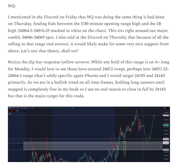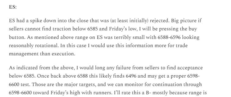 NQ low of night was 24076, the area which had been well-bid Friday. Any hold of this area was a long targeting 24143 and then new highs. This also produced a large true gap up and ended up resolving nearly 250 handles with those of us who sleep likely locked out: