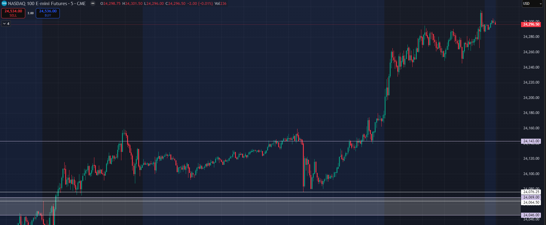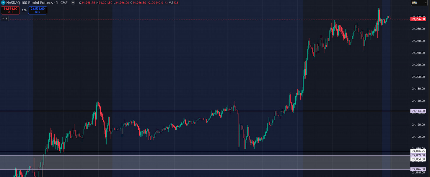 Indices are very obviously trending higher as discussed in the weekly plan. This doesn’t pause until a prior day low is taken out (without ending up as a bullish engulfing day). TradingView will switch its front contract to ESZ2025 (December) at open tonight, so I will reference that contract moving forward.