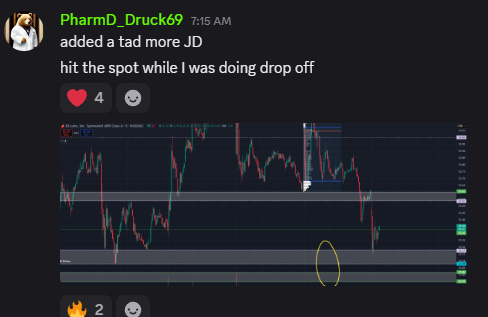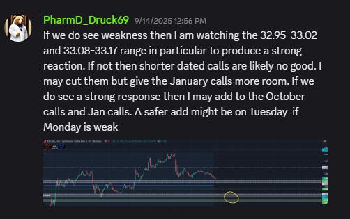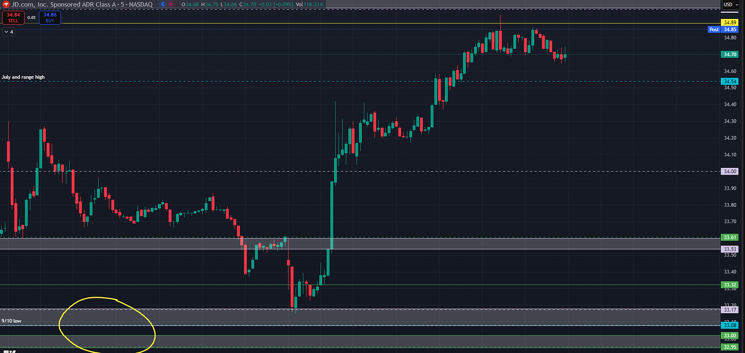 We had taken a starter on JD 0.00%↑ in the Discord on Friday, and were looking for adds in the 32.95-33.02 and 33.08-33.17 range if we saw weakness into Tuesday: