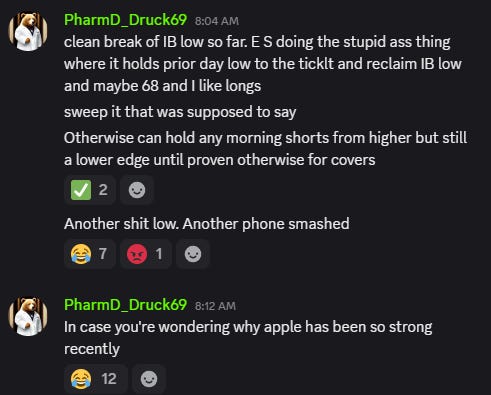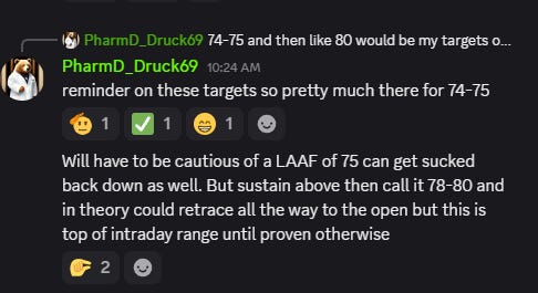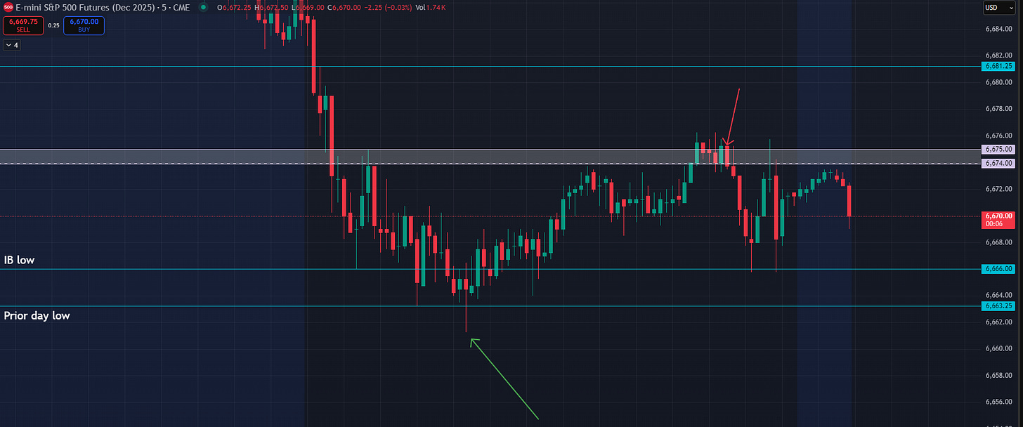 Make note of the additional strength that was gained (still not a ton) after yesterday’s low had been swept. I had identified 6674-6675 as an upper edge so that was the major target for the long (with option to short a look above and fail).