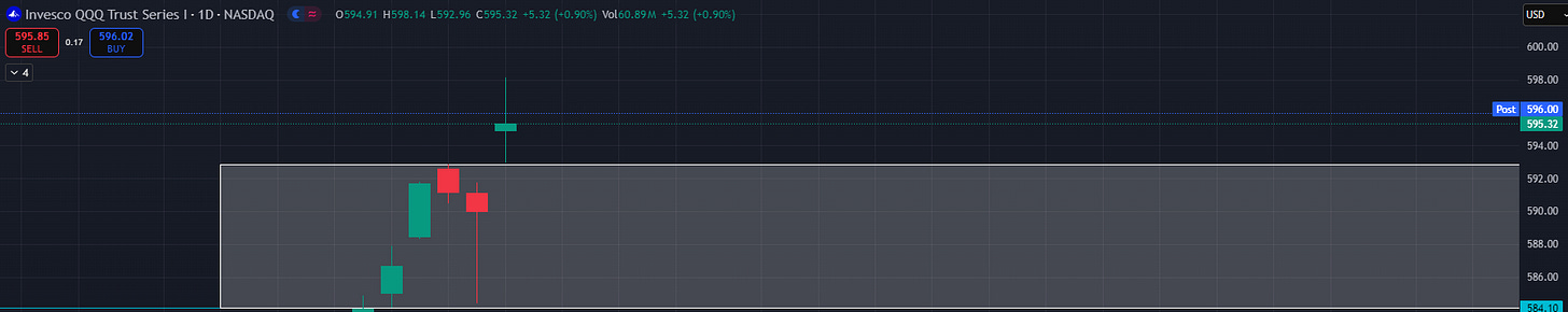 Yesterday’s FOMC day had done nothing but bring both QQQ 0.00%↑ and SPY 0.00%↑ to 4- and 5-day boxes respectively. Trading within yesterday’s range was likely to be extremely choppy, but the market was kind enough to gap out of it entirely.