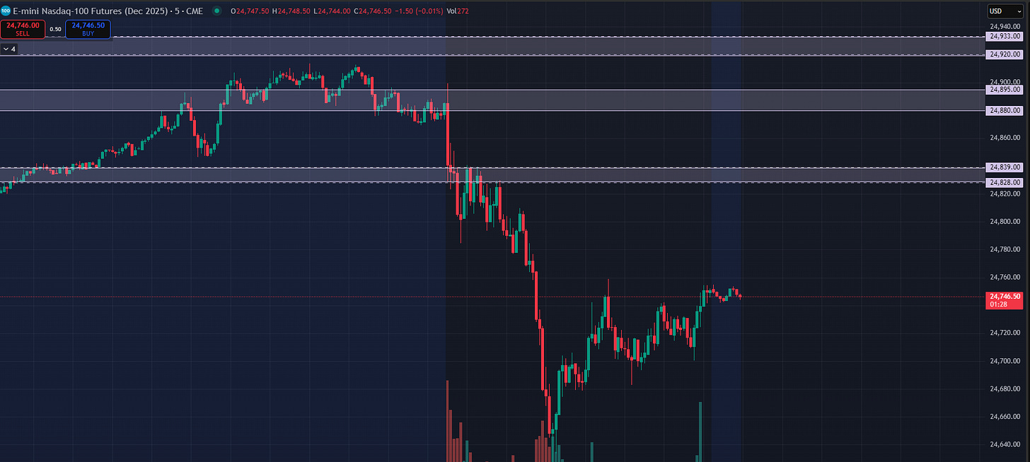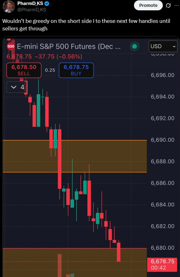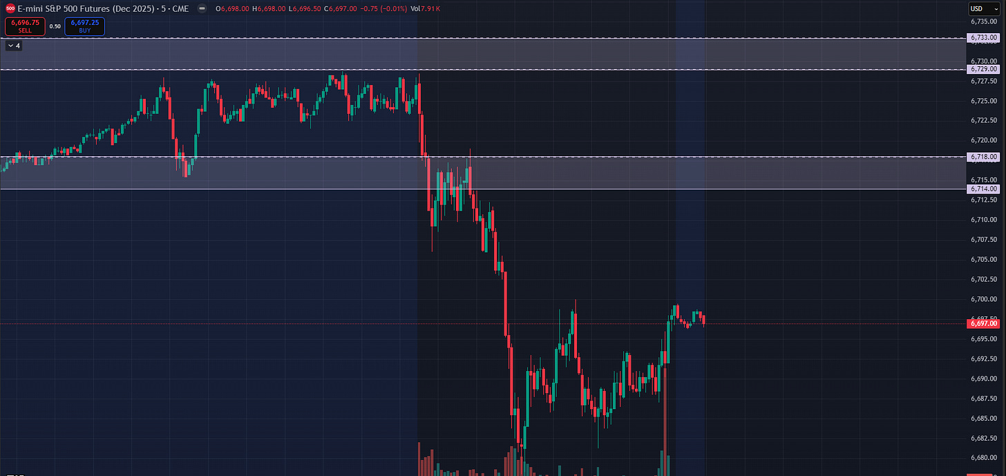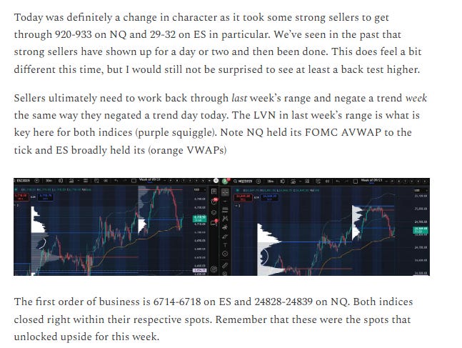 In last night’s plan we expected a back test higher. The question is always whether or not to sell this back test. Sellers needed below 6714-6718 on ES and 24828-24839 on NQ and both indices closed in those ranges. Because yesterday’s tape felt a bit different and because of the profile characteristics left behind, it gave sellers an opportunity to defend and then prove a willingness to sell below these areas today. From last night’s plan: