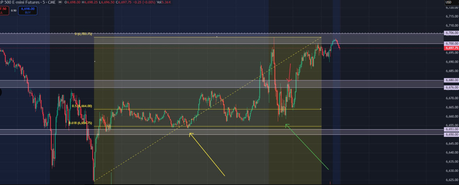 Coming into Friday we were looking for a shift in structure on the 30-minute chart, and if so, for bulls to look to defend a higher low. They would have to do so by 6650-6653. Bulls continued to control 6650-6653 overnight (overnight low 53.25 yellow arrow), drove into major resistance at the open, and bid the higher low right between the 0.5 and 0.618 retracement and just above 50-53 (green arrow). Sellers made an attempt to defend 6676-6680 from below (red arrow) but were absolutely brick walled and lifted. Pretty much every time 30-minute structure has shifted back to the upside the pullback has been over. Will this time be different?