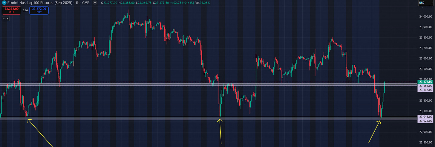 The major spot for the last couple of weeks has been 23342-23369 on NQ and 6431-6435 on ES. A loss of that spot opened a retest of 23023-23046 on NQ and 6376-6382 on ES. This is a very clear line in the sand for NQ.
