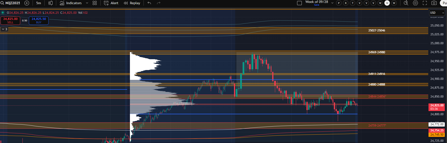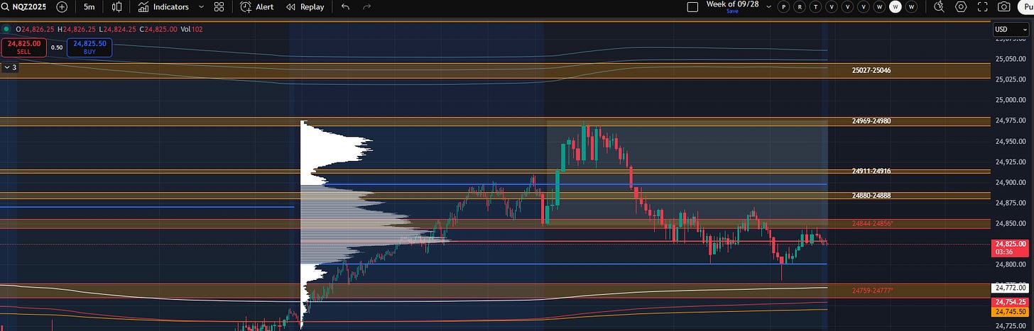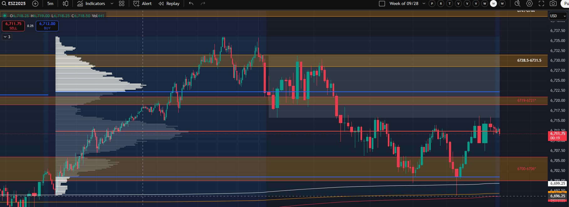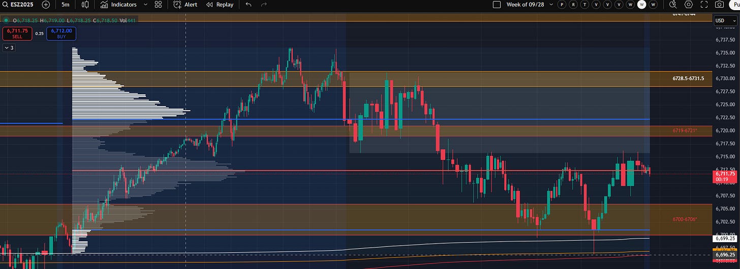 After reclaiming 6700-6706 early in the overnight session, ES rallied all night making the 6719-6721 target by the Tokyo close. Europe continued the bid making it to, and finding a quick excursion above 6728.5-6731.5 before finding a decent seller premarket. The RTH high was capped by the 28.5-31.5 spot which came as NQ tagged really the last line of defense for sellers at the 24969-24980. From there the fade was on as ES came all the way back to 6700-6706 and the VWAP cluster from the weekly video. ES tagged Friday’s 4pm close and the VWAP cluster, but sellers (for now) found no traction below 6700-6706.