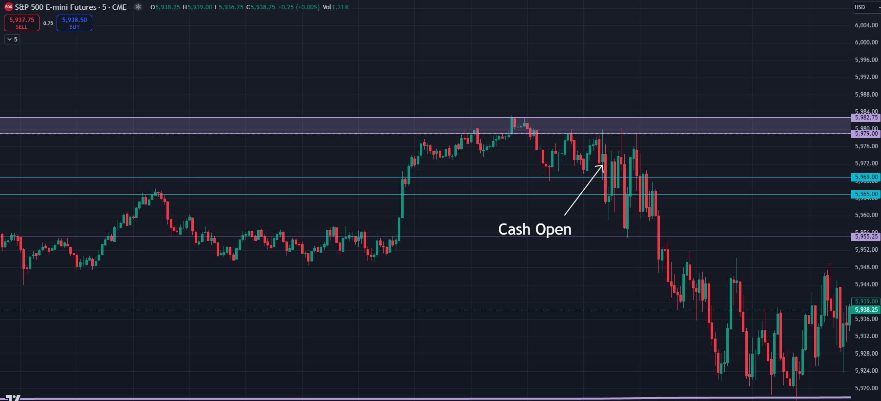 The location of today’s open made for some very awkward trading so if you got chopped up it probably wasn’t you. My plan was to be patient and selective and frankly I ended up losing my patience and missing a move. We were set to open between last week’s low and our weekly 5979-5982.75 spot where there was quite obviously a strong seller premarket. Last week’s low was 5965 and we were monitoring 65-69 to provide a bit more certainty of a reclaim. This made for a high likelihood of choppy early trading.