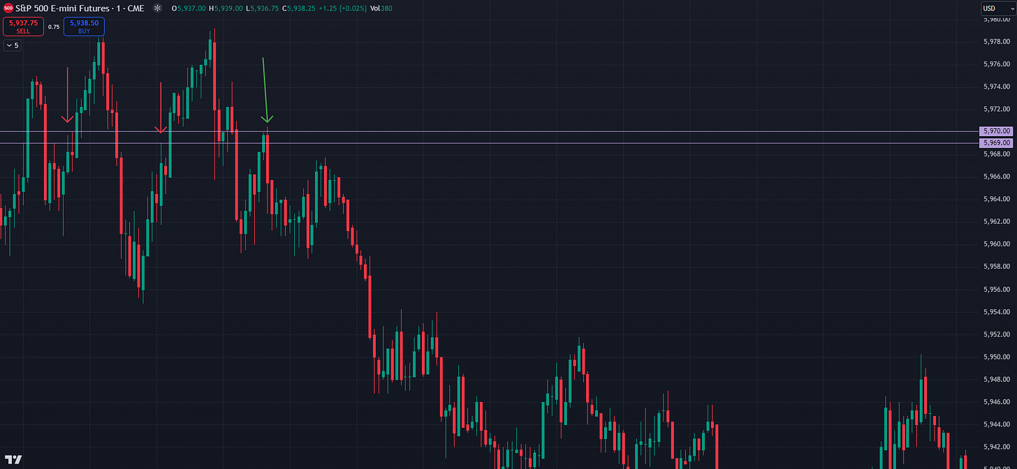 I personally shorted 5980 twice with the premarket seller at the open and 10am, covering some on the way down and trailing out on runners when sellers failed to defend a lower high. I therefore wasn’t prepared to be short (and was even planning to wait for a dip to get long) when the seller hit the tape again at 10:25 with absolutely enormous size. We then finally saw a lower high defended and the IB low was broken. From there the day was a short but was frankly still a bit awkward because of the importance and strength of some of the levels below the IB low.