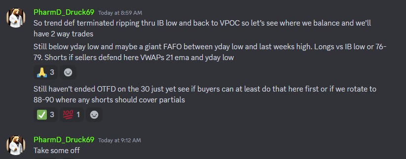 The back test of yesterday’s low at 11 EST was probably the safest short to take today. It corresponded with the 21 ema on the 5-minute (red) and both the overnight (blue) and RTH (purple) VWAPs. From there it was a battle between buyers at the IB low and sellers defending yesterday’s low.