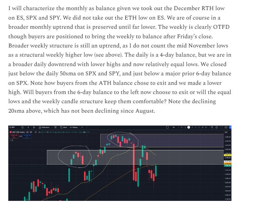 Today’s low held Friday’s open on SPX, and on ES it was the RTH low from the 12/18 FOMC day. Neither side has had a ton of success breaking away from the 12/18 range though sellers have clearly shown more progress.