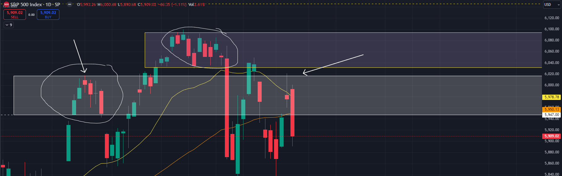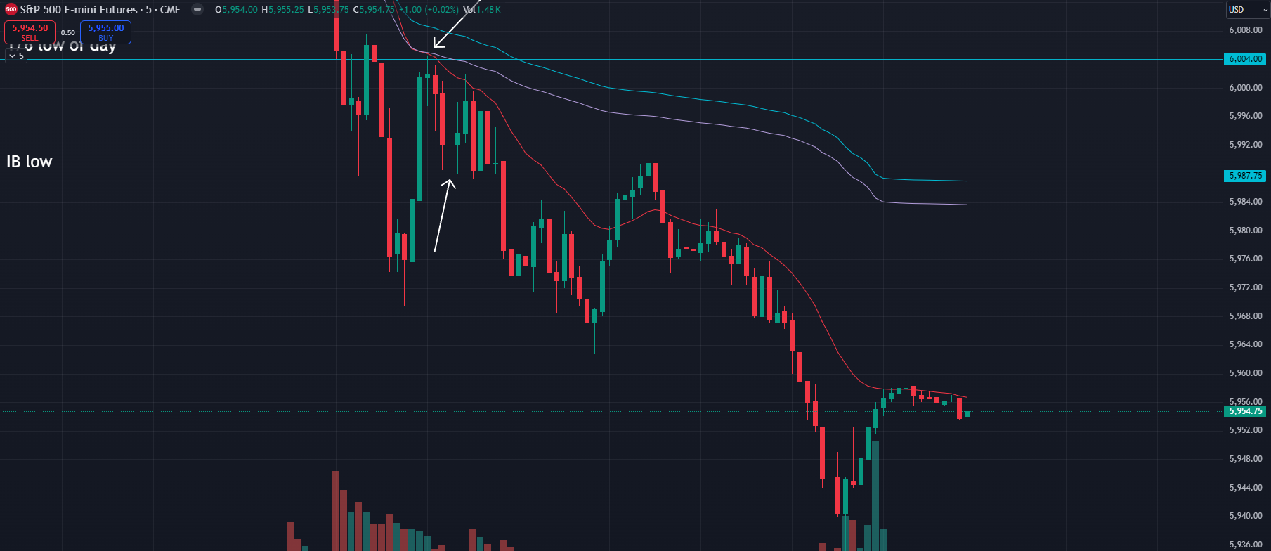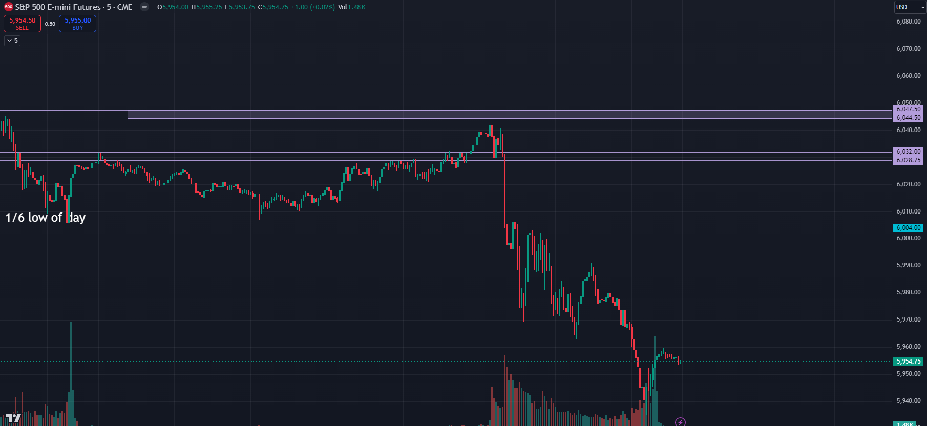 For today we were looking to be short below 6028.75, and open to a long above 6028.75-32 at least for a test of 6044.5-6047.5 where caution was warranted. The overnight offered a nice short below 28.75. Late premarket reclaimed it and rallied to 6045.5 at the open where the selling started. The low of the first 30 minutes was 28.5 which made things somewhat unclear. The data at 10:00, however, cleared matters up quite quickly and the rest of the day shorts were generally favored as we traded below Monday’s low.