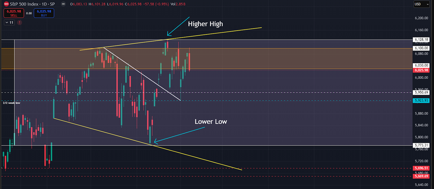 Because of the amount of volume that was put in around 6030 SPX on Friday, it is reasonable to consider it to be an early week battleground. In our full plan we will use a slightly different spot but from a high-level perspective 6030 SPX is reasonable for the first move of the week.