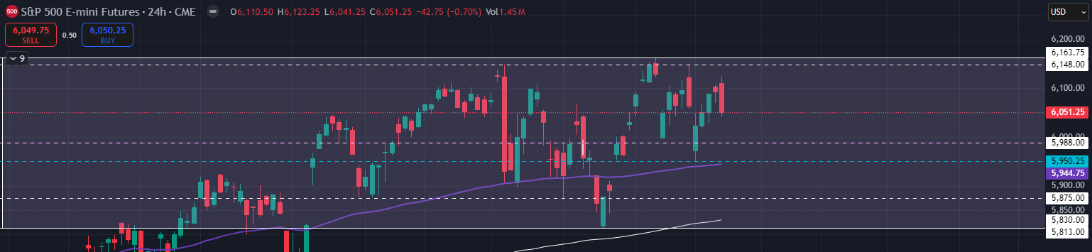 Note on the above the full range is 5813-6163.75 (we’ll discuss where 6163.75 comes from in the full plan but it isn’t relevant here). The midpoint of the range is roughly 5988. Last week’s RTH low is shown in blue. The AVWAPs that can be seen in the picture are the September FOMC rate cut AVWAP (purple) and the August swing low AVWAP (white)