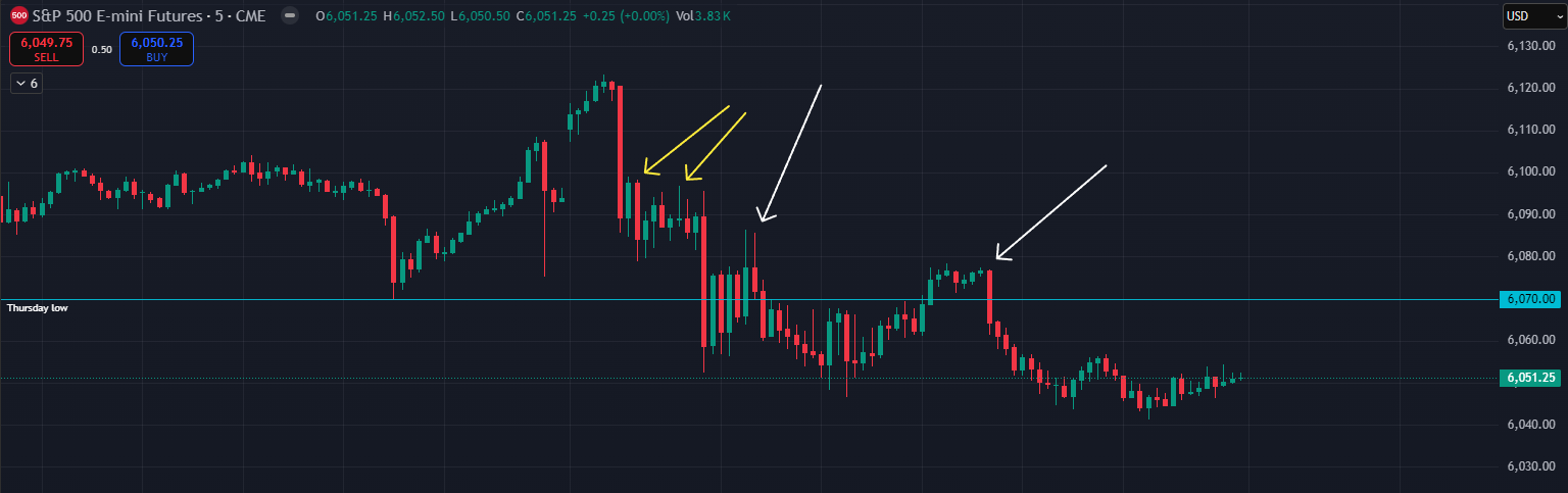 Looking intraday Friday, we note that sellers actually mounted a defense BEFORE the second news driven tape bomb. After the sentiment tape bomb, sellers were defending 6100 (yellow arrows and well below the 6107.25 opening range low) which preserved the possibility of single prints (see the free section of the starter kit if you are unfamiliar). The second tape bomb on tariff news solidified it but sellers were already in the tape. They defended two more times (white arrows) and were willing to sell below a prior day low for the first time in ages during RTH. This is again perhaps some very subtle nuance, but it is worth noting.