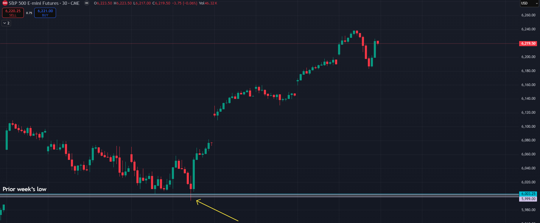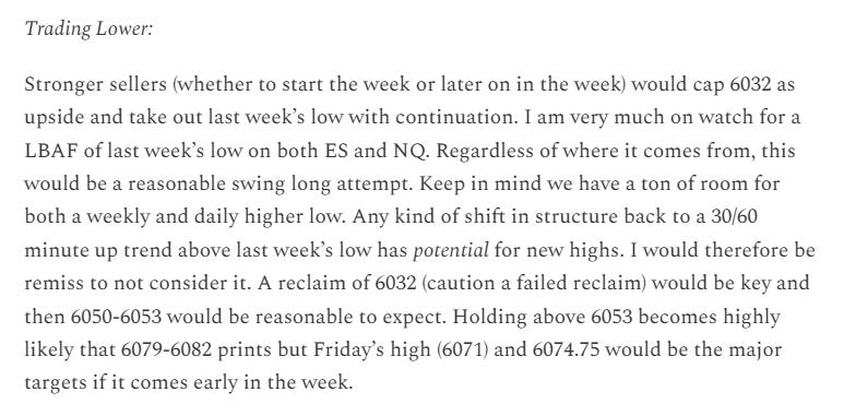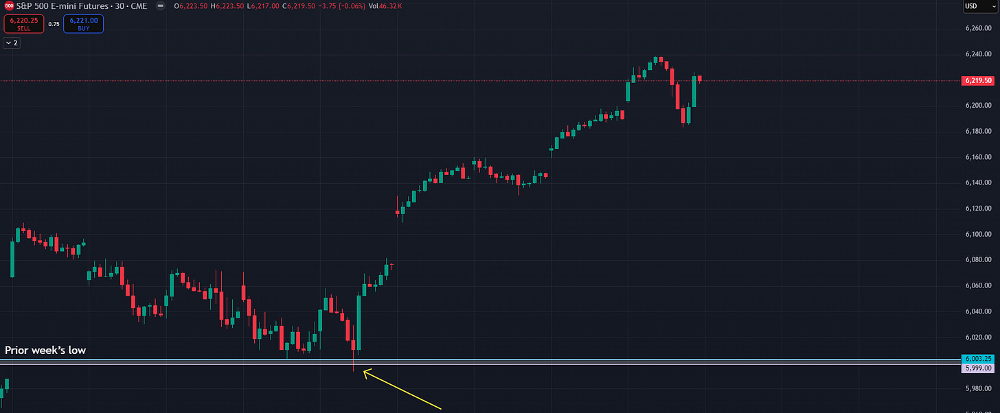 Coming into last week the indices in the midst of a short time frame downtrend. Therre was plenty of room for a daily or even weekly higher low, and the only question was where that would be. The first test for sellers would be finding an ability to trade below the prior week’s low 6003.25. Any failure from sellers to do so was a swing long setup. Once 30-minute structure shifted back to the upside, a daily higher low was in place and the index never looked back. From the weekly plan: