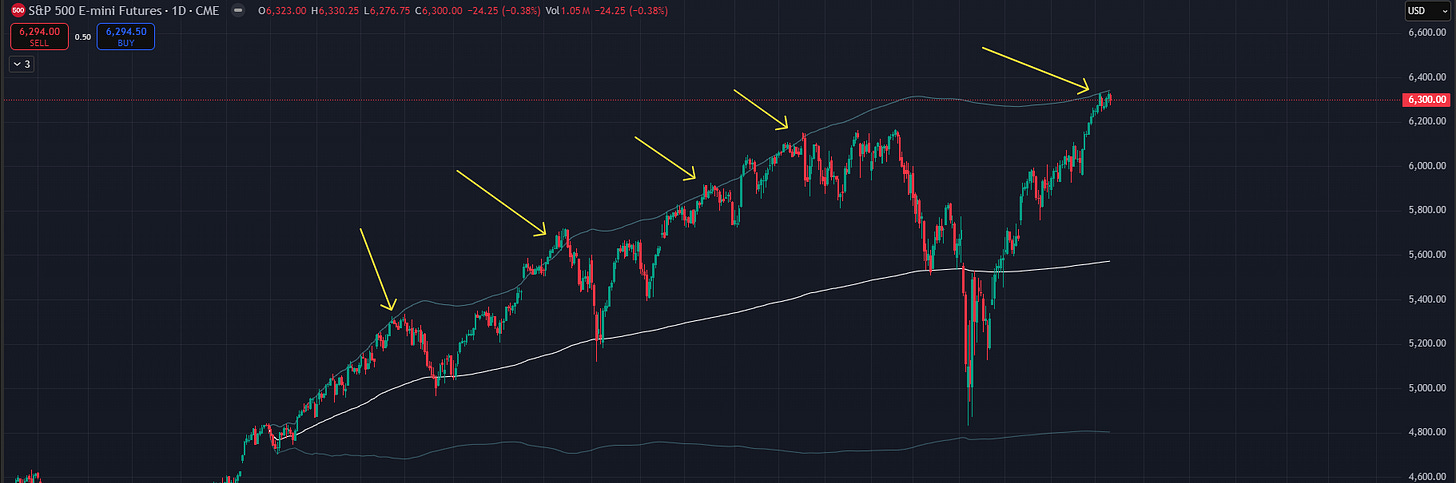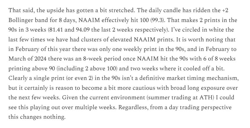 After riding the +2 Bollinger Band for 8 day, ES reached the +2 standard deviation from the 2024 VWAP on 7/3. NAAIM also effectively hit 100. After a continuous move higher, it made sense for a pause here. Thus far we have seen sideways consolidation. If this turns into a pullback, there is plenty of room for a daily higher low.