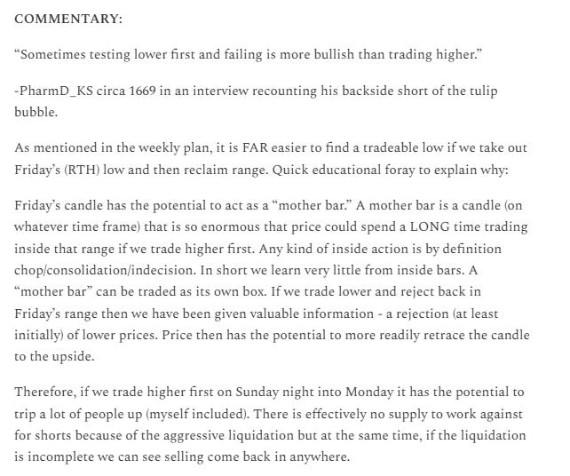 In last weekend’s plan for Monday, I discussed the potential to have “Mother Bar Problems” this week. I suggested that it would be easier to find a tradeable low if we took out the 10/10 low first during this past week. We instead traded higher first, and “mother bar problems” were triggered.