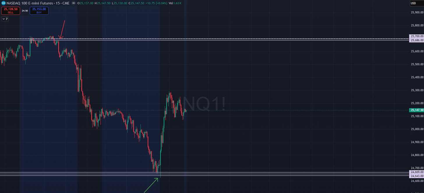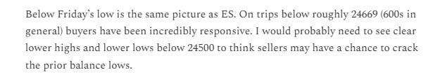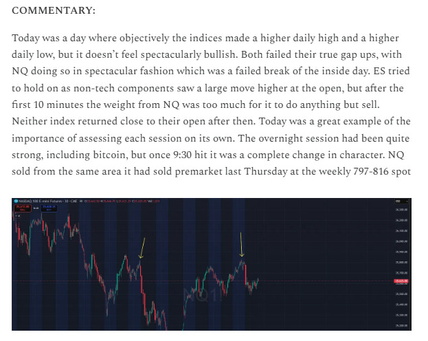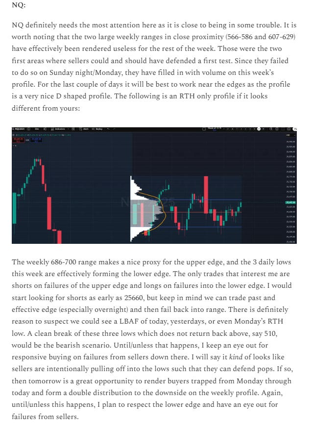 Sellers did not defend any key area on Sunday night into Monday. They did, however, defend all pops above the 11/2 week all-hours VPOC on NQ. This ended up forming a trading range in the first 3-days of the week. This had us cautious, even bearish, into Thursday. From Wednesday night’s plan: