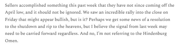 In last week’s post above the paywall I suggested that sellers had accomplish something they had not since coming off the April low. Further, that if we ripped higher on news of a resolution to the shutdown (both of which we ended up getting) that the signal needed to be carried forward anyway: