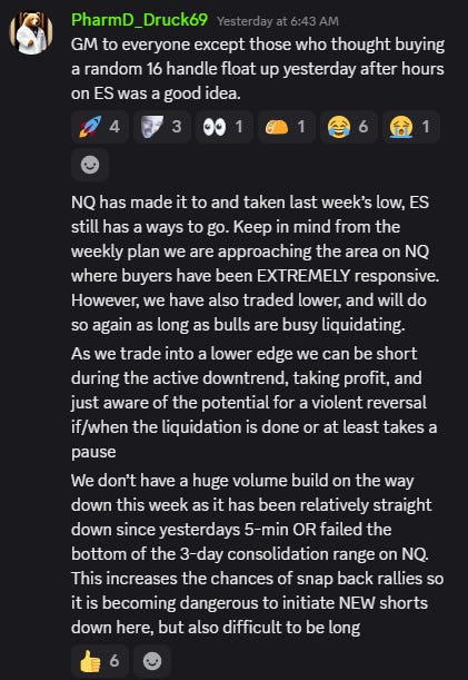 We saw Wednesday night/Thursday morning make a failed push above the upper edge that was met with responsive selling. This short setup ended up resolving for more than 1000 handles into Friday’s low which was an absolutely massive spot outlined in last week’s plan and reminded in the Friday premarket update: