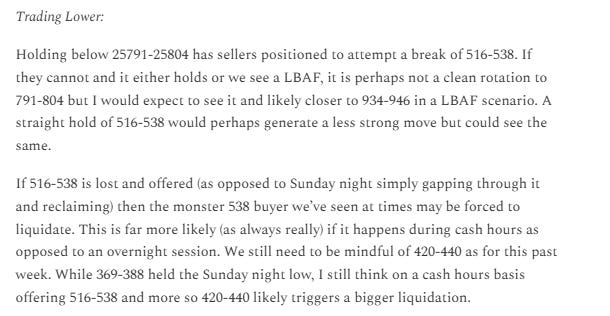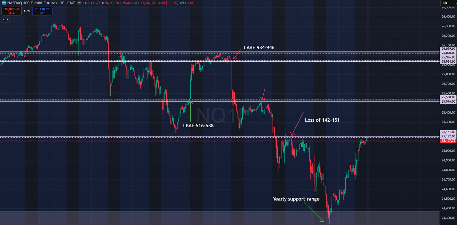 In this past week’s plan, I questioned if we would see a risk transmission into equities following the last Friday’s move in precious metals. On Sunday night we saw a massive selloff in equities driven by South Korean markets which triggered what I’ll refer to (shorthand) as a soft halt. This led to a spectacular recovery and ultimately a short squeeze on Monday as NQ opened above our major weekly level 25516-25538. This rip higher then triggered the weekly short setup, a look above and fail of 25934-25946. The ensuing selloff took NQ below the critical 516-538 range, which then accelerated as expected below 25142-25151. By Thursday’s low it was time to be fully covered on shorts, and I was out of all futures shorts, March QQQ puts, and SPY puts.