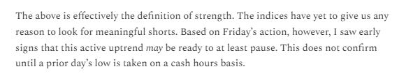 When the market was in an active downtrend with sellers in full control, the only thing to talk about was potential UPside. Otherwise, it is easy to stay short. The last few weeks the focus has been on what must happen to negate this uptrend. That way, if it does not materialize it is straightforward enough to stay long. That will again be the focus for this week. We will understand what must happen to even neutralize this trend let alone reverse it.