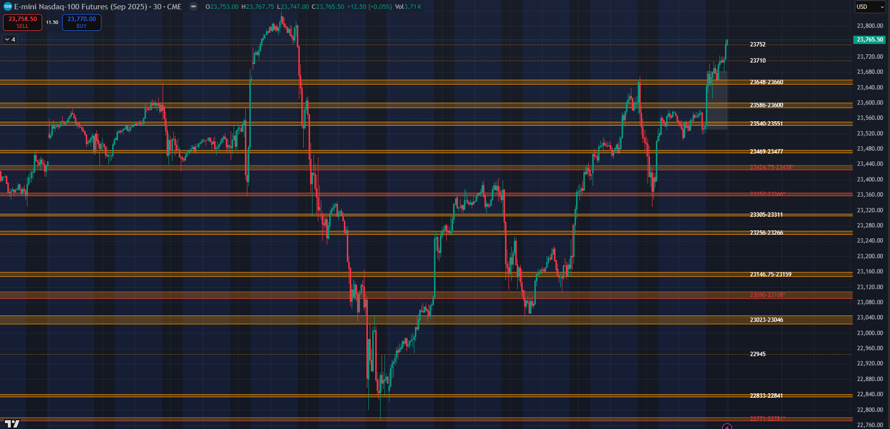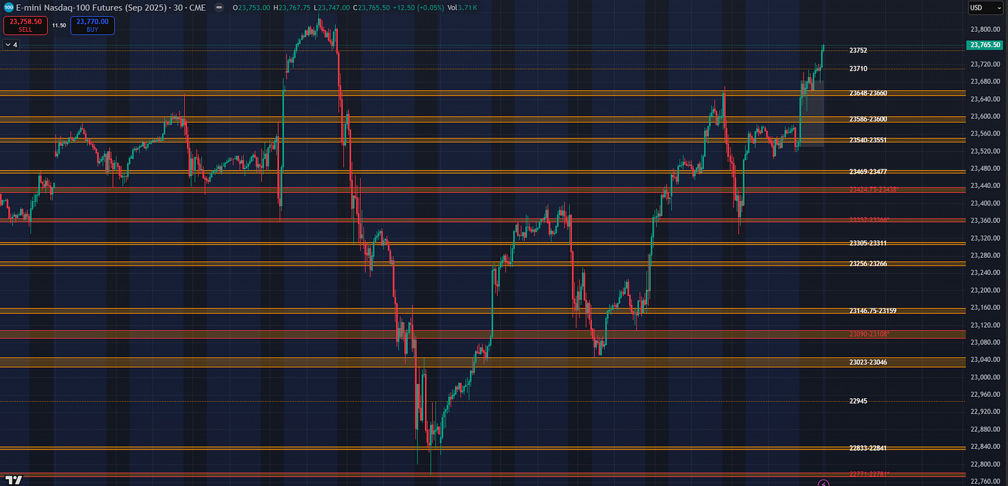 The trap of the week was easily the Tuesday evening look below and fail of Tuesday’s low on the AMD earnings release. After holding the weekly 23023-23046 and reclaiming the major weekly 23090-23108 spot, it went on an absolute tear taking only a slight pause after the massive (but thin) Wednesday evening move.
