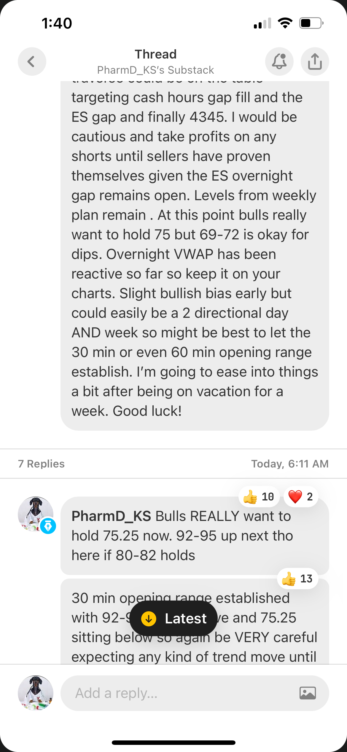 If you are a paid subscriber, let me know if you did NOT get at least the initial notification that the chat thread was created this morning. Should have been notified that it was created shortly after 9am EST and I posted multiple times in there today along with the open chat. I want to make sure everyone is getting full value here. If not I’ll figure out a workaround but go into that chat thread and make sure you have alerts turned ON for replies. You can separately mute replies in the public room bc that can of course be way too many notis. Would look something like this.