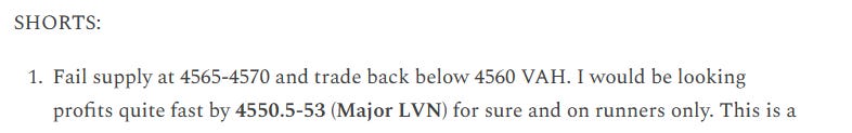After Monday’s trend day up the market took a breather and filled in some of the poor structure. Today’s first short setup played out perfectly during the overnight and premarket session. ES traded up to 4567 into supply during Asia and then cleanly trended down all night ultimately offering 4560 from below multiple times giving multiple opportunities to enter