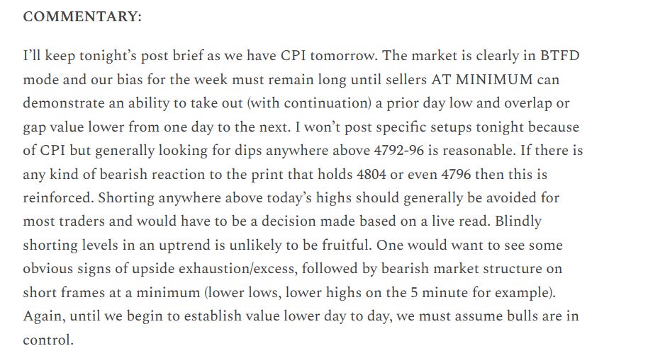 In last night’s commentary we discussed the discussed where bulls would need to defend on a bearish reaction to CPI, and what it would look like for us to short above today’s highs. Below is the full commentary for learning purposes: