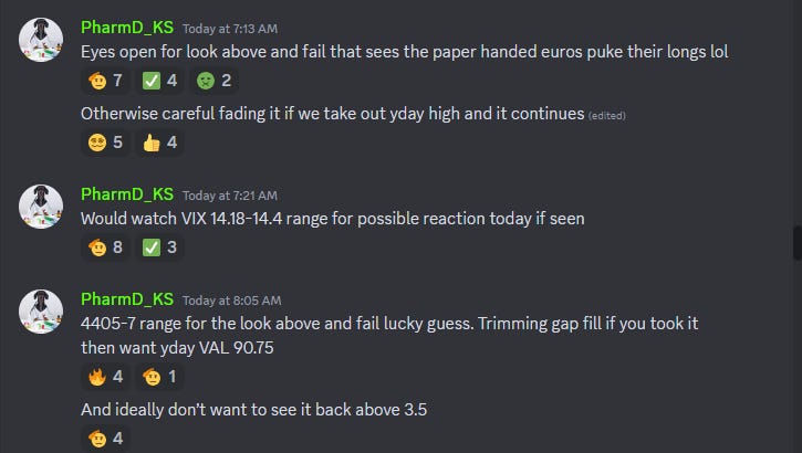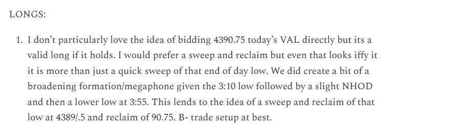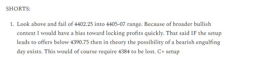 Once again, both of our top 2 setups played out exactly as described. The first was the overnight long which involved a sweep of 4389 and reclaim of 4390.75 which ran overnight into the open to high of day at 4407.75 (see 1st picture below). The second was the juicy short setup on the look above and fail of 4402.5 (typo in post said 2.25 but the level provided was 2.5) into 4405-7 range. A reminder of this setup was posted in discord before the open as well. High of day was 4407.75 and low of day was 4375 off this setup. Trims on this short were also posted in the discord ahead of time.