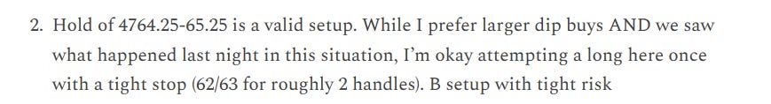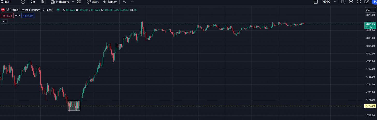 Within 3 minutes ES buyers liquidated in a rather nasty looking sell that took price right to our first long setup for the day. It was a rather strange way for this setup to play out, consolidating for so long in the 80s-90s range first. Our major spot of 4771-4775 was tested (73-76 given as the range to hold for today) and there was another battle as this was last line for buyers in my opinion. I posted on X how I would have executed this long (I was busy covering the short) so I’ll share that here as well. If this spot held, the squeeze was sure to be ferocious.