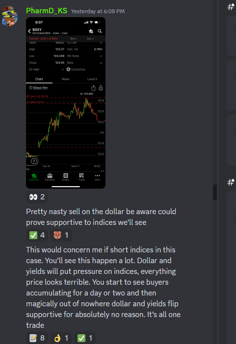 With futures session open and ES at this key resistance, the dollar hit a major resistance and began to sell off hard. The dollar (and yields) has a reasonably strong inverse correlation with indices. This happening with ES at resistance was exactly what was needed to break out.