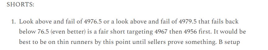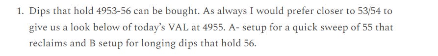 Price came right back down to 4955. It held 4955 exactly (a false break of the overnight low would have been preferred and had more thrust) and traded right back to retest the open (4970). One could have reasonably captured 50 handles conservatively in a matter of 3 hours. 4953-56 then offered 2 additional longs back to 4970 before finally breaking a bit higher into the end of day.