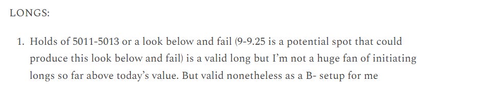 At least as of today, it appears that SPY 0.00%↑ is back to bidding the first support seen. The first setup for today was to hold a hold of 5011-5013. The overnight low was 5011 to the tick and the cash hours low was 5013.75. There is also something very important that we learned today (it isn’t the first time it has happened) which I will share below for some chuckles. The long setup from last night: