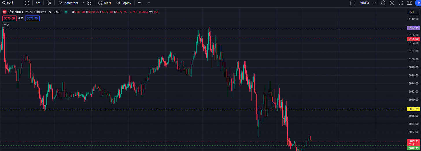 Today was one of the days where timeframes conflict and so price action can get a bit choppy, so the usual warning was issued in the Discord for these instances. Overnight our long setup had played out perfectly and was frankly the easiest trade all day/night which wasn’t super helpful for those that only trade cash hours. Price ripped off 5087.75 (87.25 overnight low) to our 5107.75 level (5108 high of day). It was the trade down that was very choppy, and this is because of the conflict with higher time frames being so bullish.