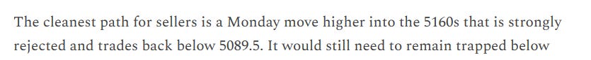 We have been monitoring for the possibility of a “trap door” setup in the index for some time. The move into yesterday’s high triggered this possibility. We were watching for 5160s from the weekly plan, and specifically 5157.5 for Monday’s plan for a sell to occur on a “failure to go higher.” From the weekly plan: