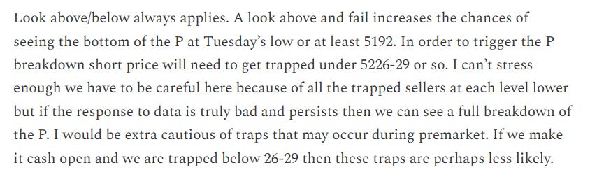 You can see that we were questioning the end of day rally as perhaps not being true buyers and that it perhaps simply cleared out some trapped sellers so we could go lower today. The bearish scenario was a look above and fail of yesterday’s high which made it easier for the key 5228.75 level to break. This then translates to a 5201.75 test and 5192 if price remained trapped below 5226-29.