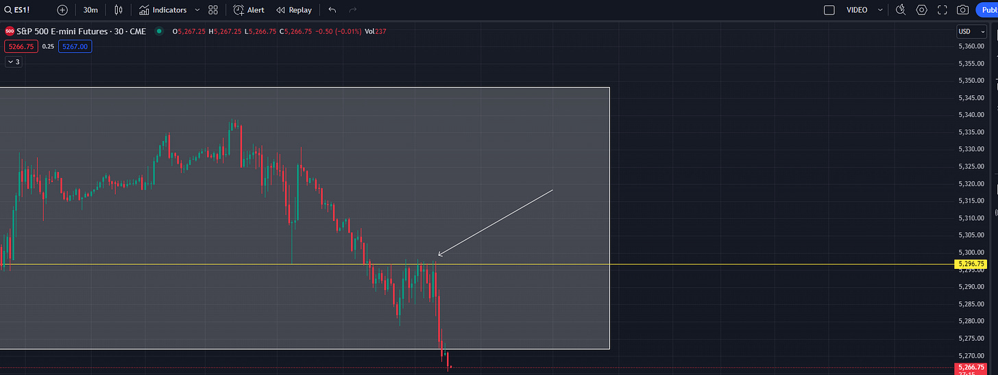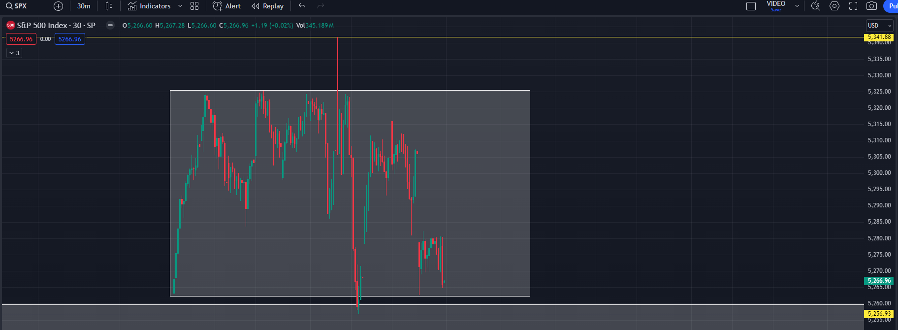 The rip into the close was indeed not bullish. We saw this at least twice in April that I recall mentioning. It is key to separate the short-term movements in price (especially very late in the day) from broader context. As of the time of this writing we have seen a significant move lower after hours, and we would be right to question this move as well. We have been considering SPX to be boxed. As of futures trading, the box has broken to the downside. However, cash hours matters most. Here is the SPX box we have been using. It is now reasonable to extend the bottom of this upper box to include Thursday’s low, or we can consider that a look below and fail. Either way, the 5258-65 range on SPX is key.