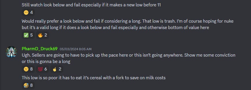 While many of us took a reactive short off the ISM, the second chance long entry was provided in the Discord. It is often the case that the overnight session (especially if there is data) steals the trade. On these days I do my best to at least provide one trade setup intraday that is low risk, high reward. At the least the long setup provided an opportunity to cover any shorts. The point at which the selling pace slowed on the approach of the IB low, the look below and fail became increasingly probably. Five minutes later it triggered and resolved for 35 handles with zero drawdown and not even a 5-minute reversal for 35 minutes.