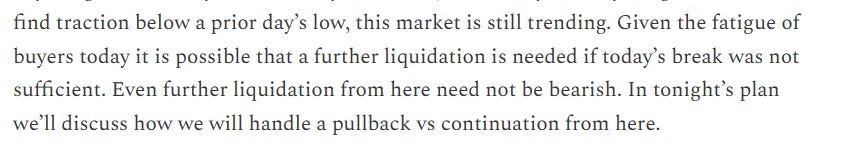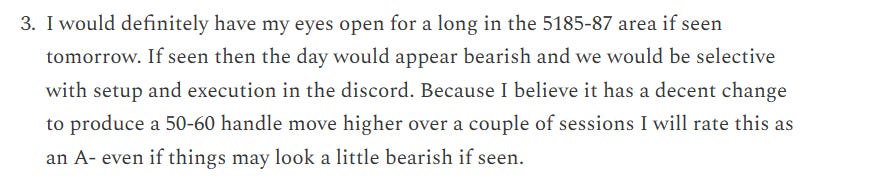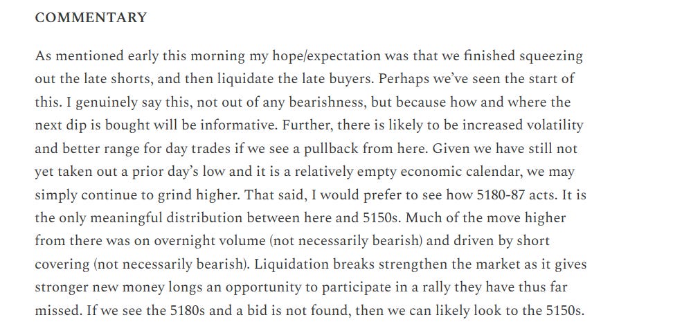 We began monitoring for a liquidation of late longs yesterday during the trading day as we traded 5220s. The possibility of further liquidation into today was discussed in the free section and planned for last night. We were prepared to buy that liquidation. From last night’s free and paywalled section: