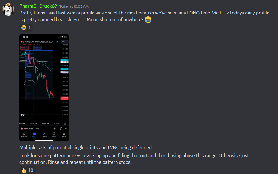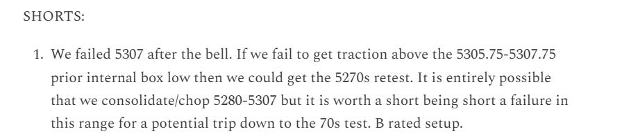 Limited recap today due to the hospitalization of a family member. The look above and fail short setup played out early and the day was a continuation short until sellers exhausted out. Anything beyond 5270 was a bonus for runners.