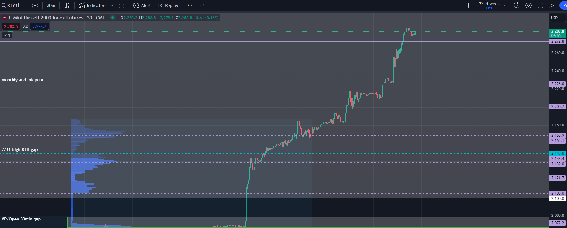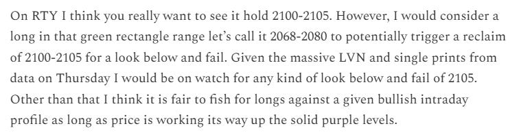Today’s top setup played out overnight and it left the RTH action on SPY 0.00%↑ a bit choppy. The cleanest trades were in IWM 0.00%↑ and $QQQ. IWM 0.00%↑ has done nothing but climb the solid purple levels from the weekly plan without threatening 2100-2105 for those who were so inclined to take longs. From the weekly plan: