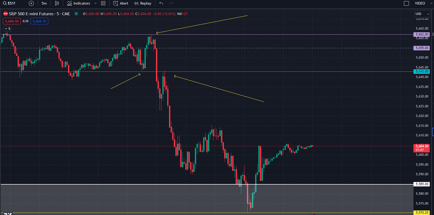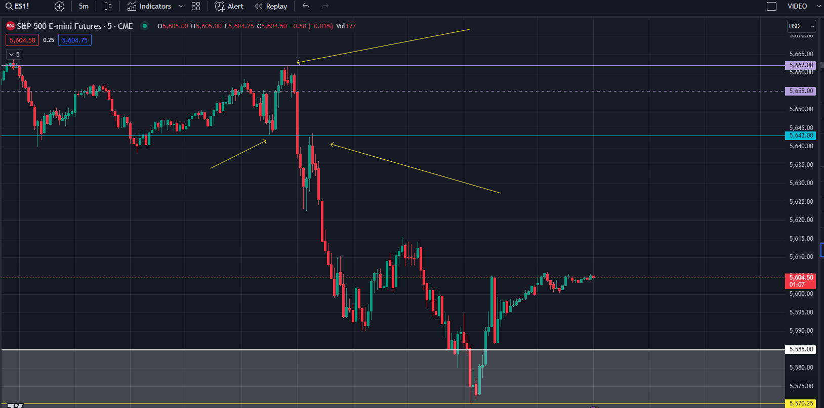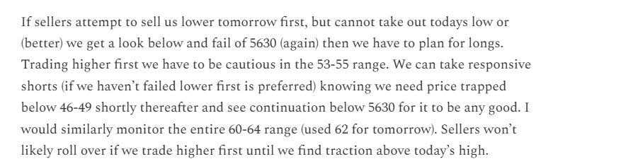 Coming into today we planned to trade against whichever side failed. If sellers attempted to break 5630 and failed, we would trade against them. For buyers, we needed to see them push through 5653-55 and 5660-64 (used 62 for today) and could short against them if the failed to do so and price got trapped back under 49.